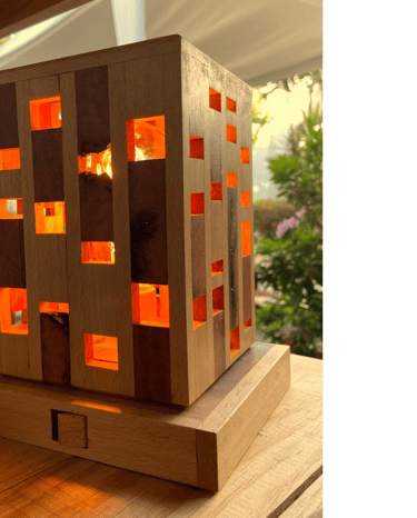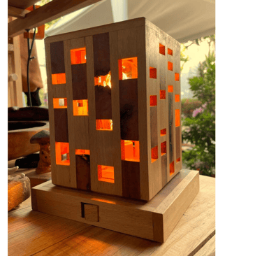 Lámpara para buró de varias maderas finas. Estética arquitectónica que genera una atmósfera suave y acogedora a través de la luz. Juego de espacios y luces.