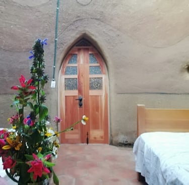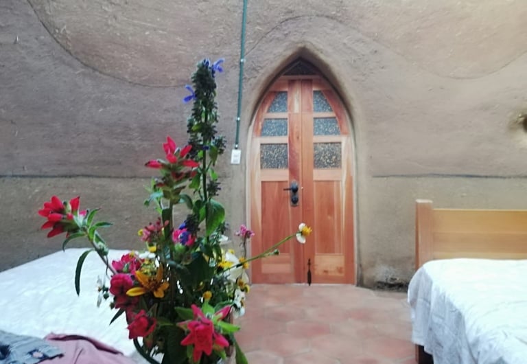 Puerta de madera de cedro y tableros de material reciclado IUSA. Construída como acceso a un domo de superadobe. El capullo de Tierra.