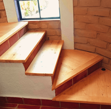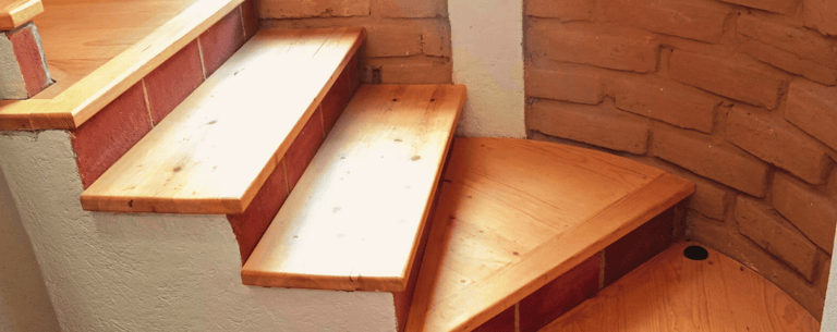 Escalera en madera de pino que lleva hasta la habitación principal.